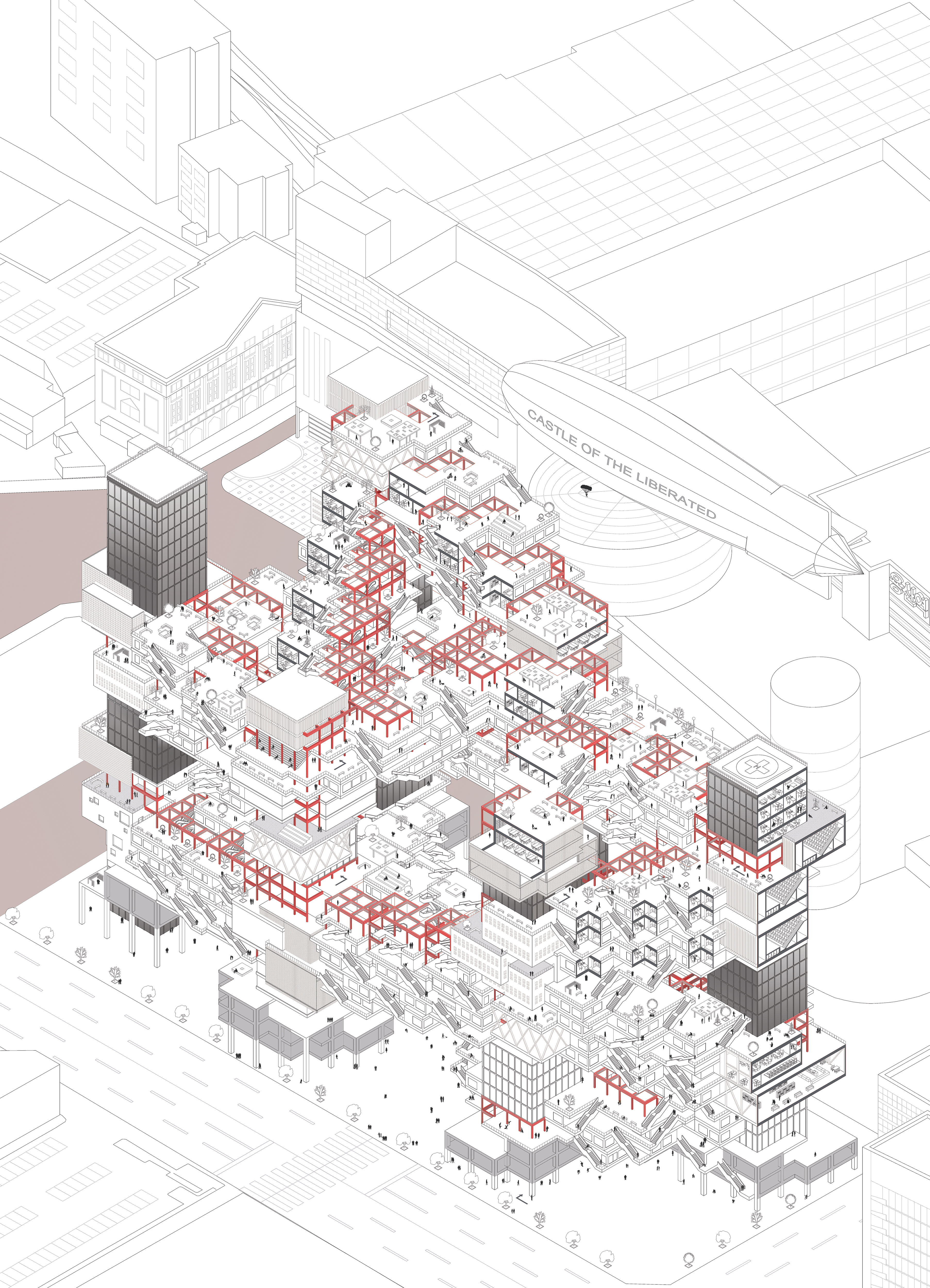 As an infrastructure, the proposal stitches the spaces and buildings nearby the public transportation system. Castle of the Liberated absorbs the audience of public tranportation system and discharge them to other places instead of keeping them in the building.