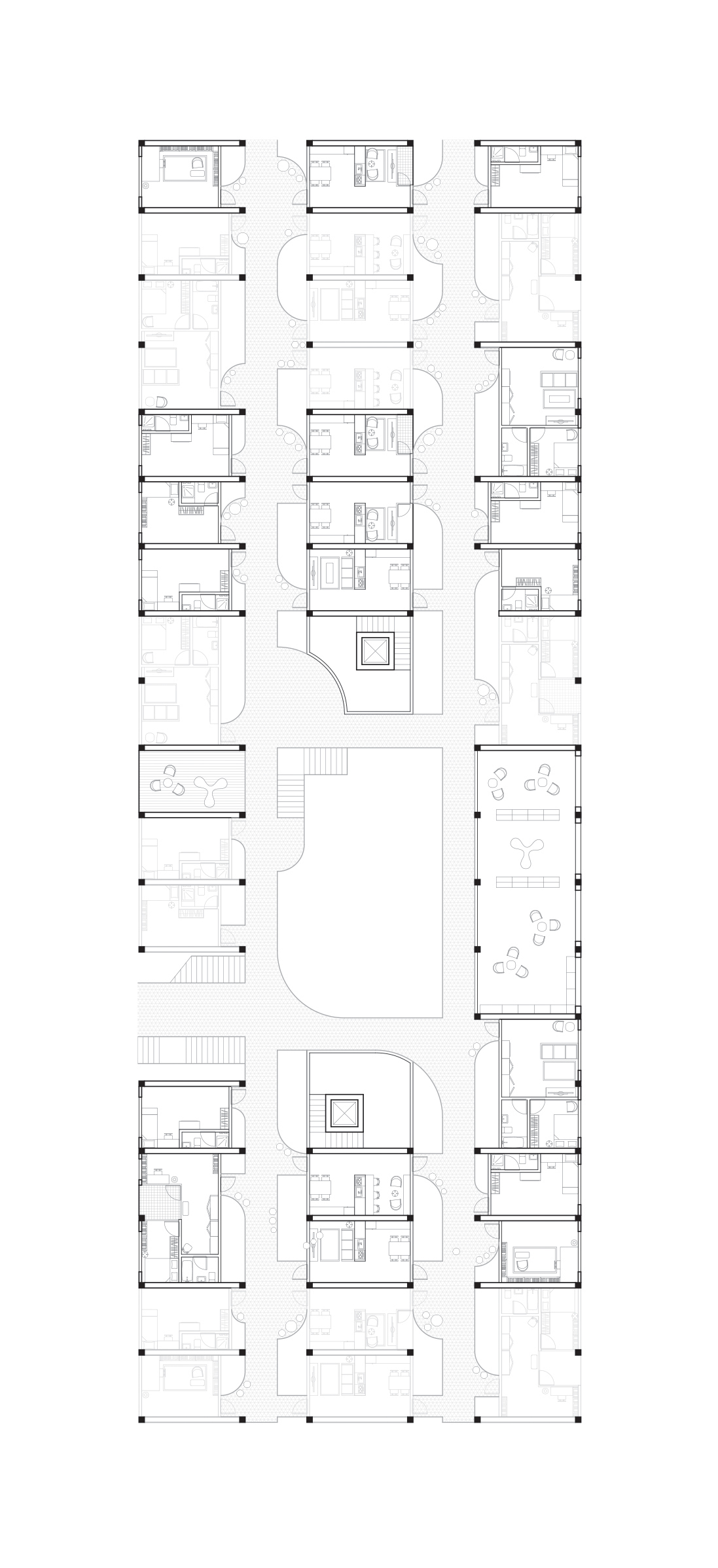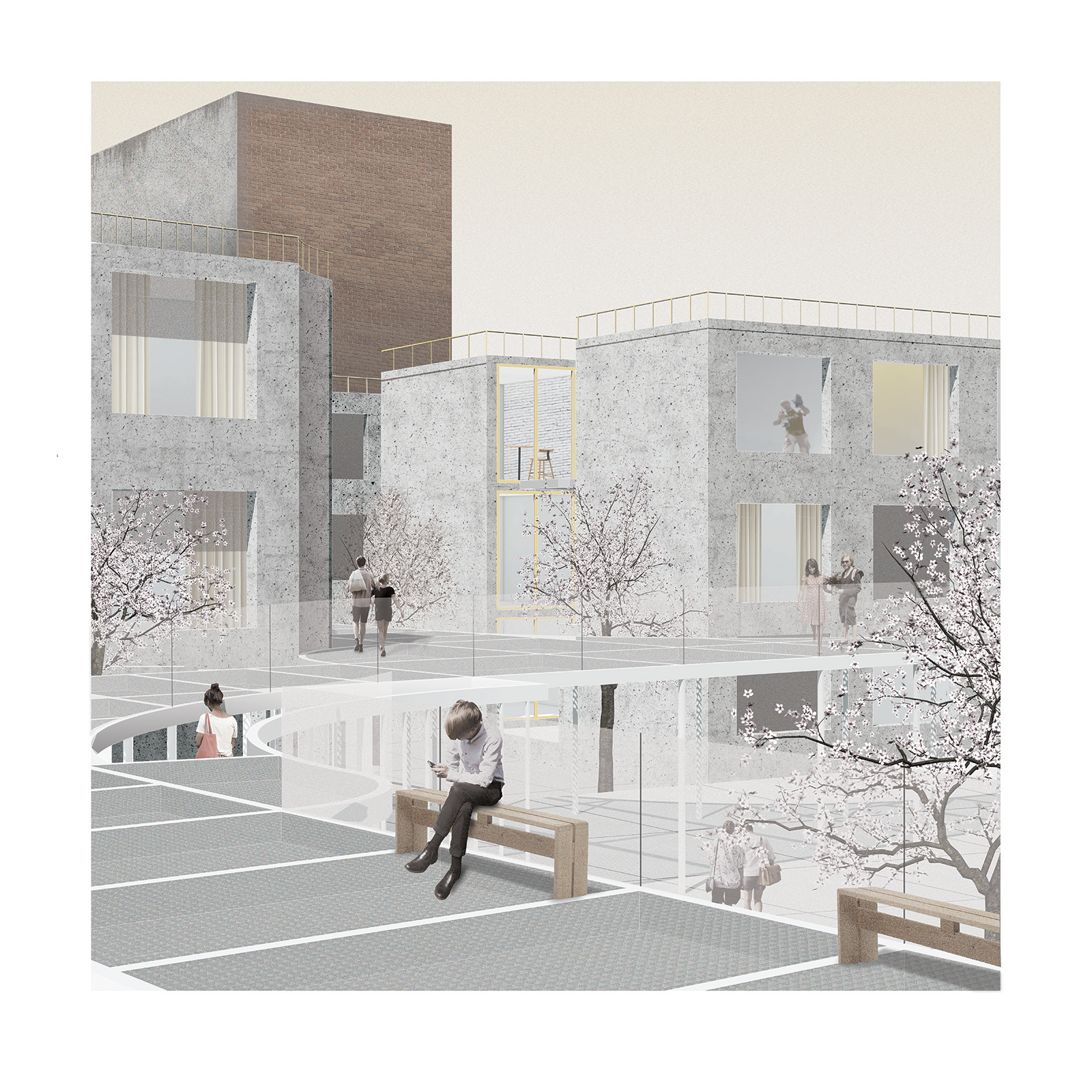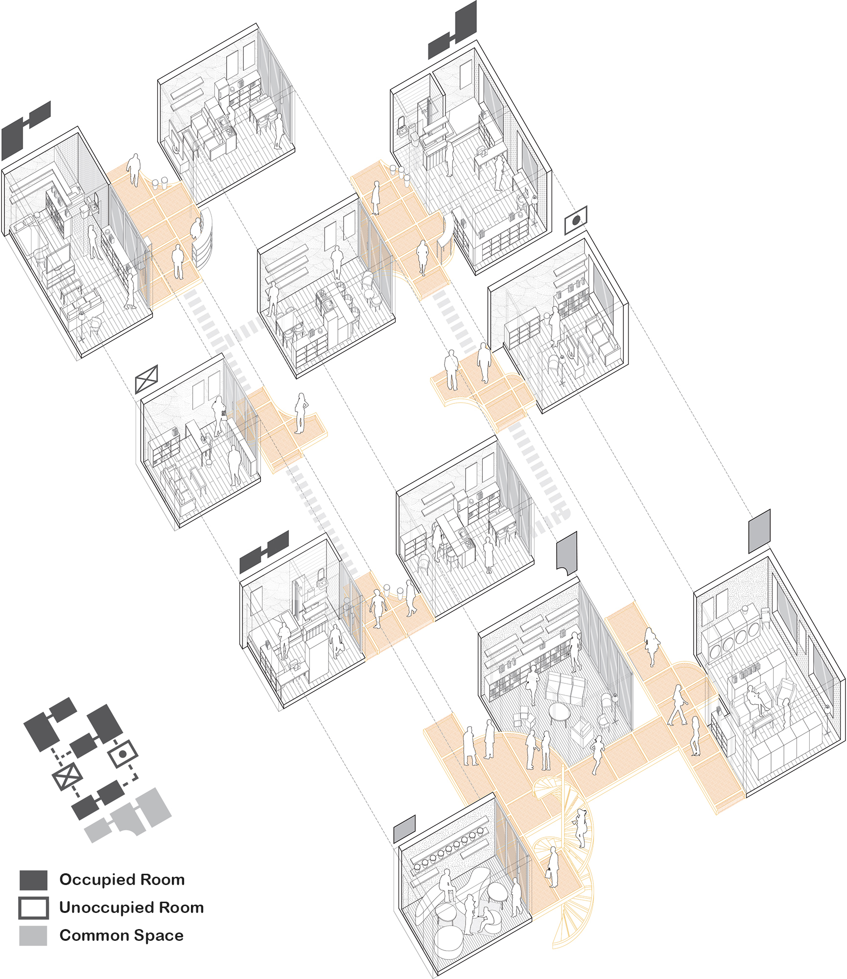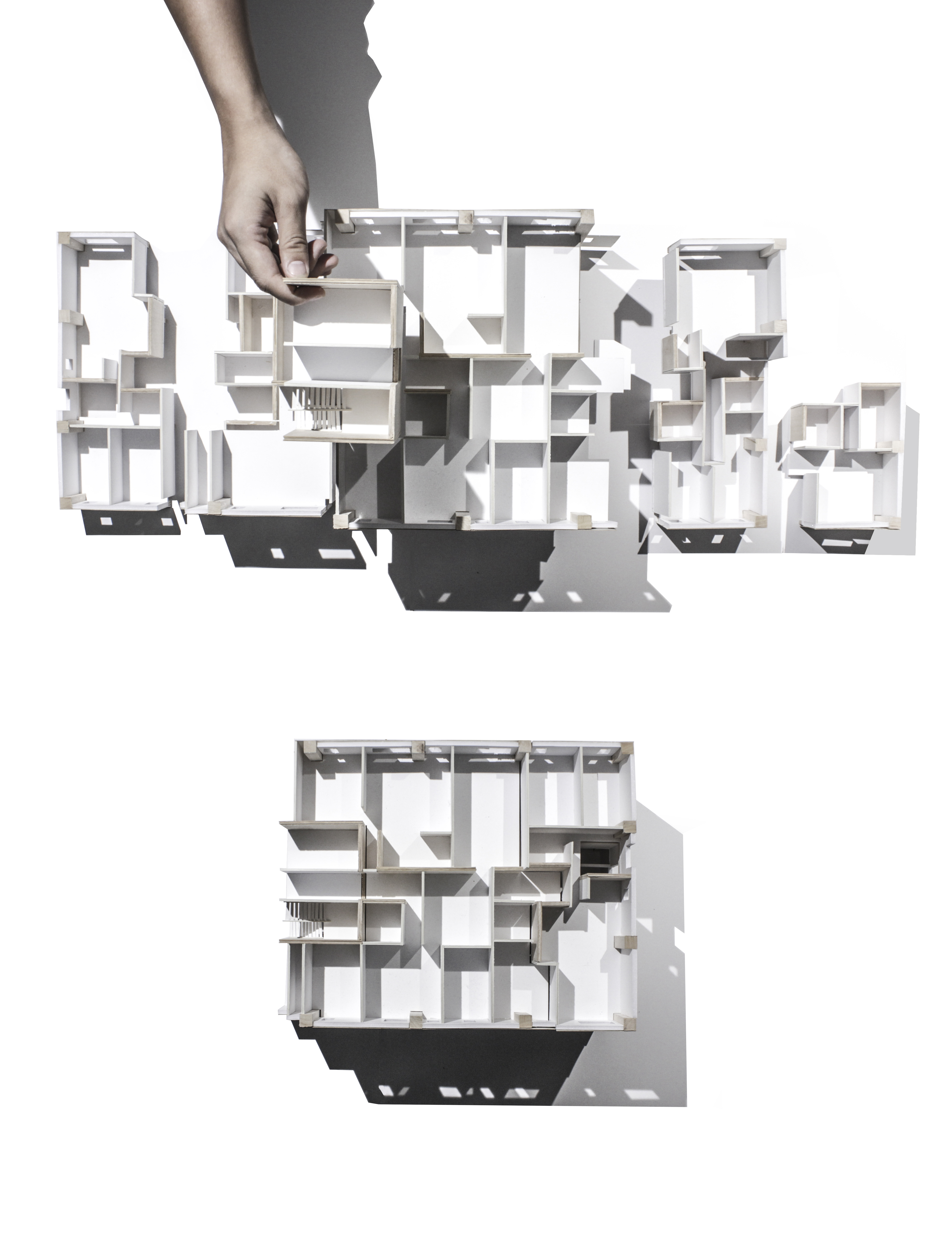 Housing complex project in Bronx, NY. The Project sought to demonstrate the needs for housing in the near future. Rather than fixed housing units by family type, housing units can proliferate by adding rooms depending upon the residents’ living conditions. The space in-between rooms, exterior corridors act as not only the pathways from rooms to rooms but also allow semi public spaces as small courtyards for users.