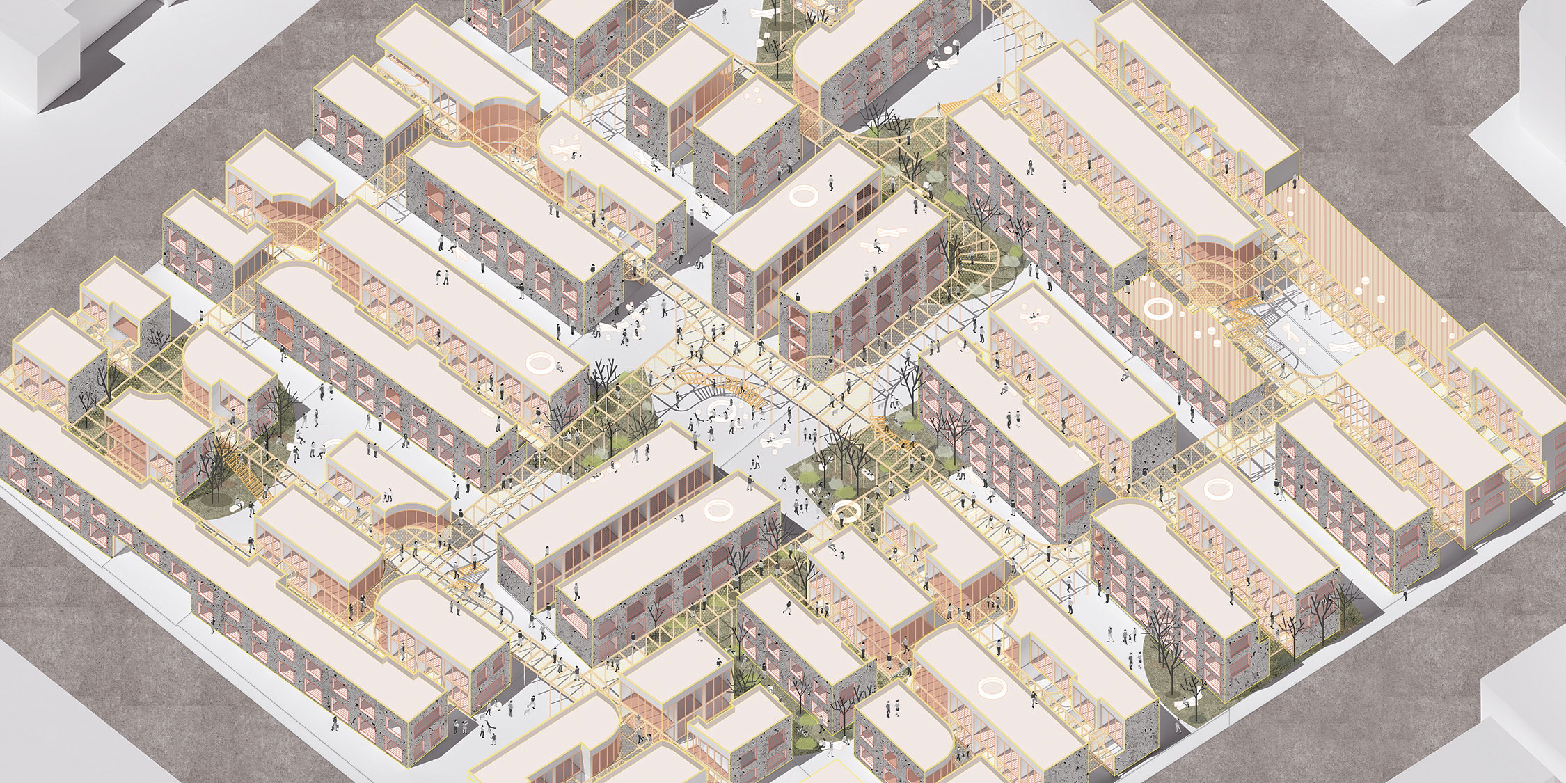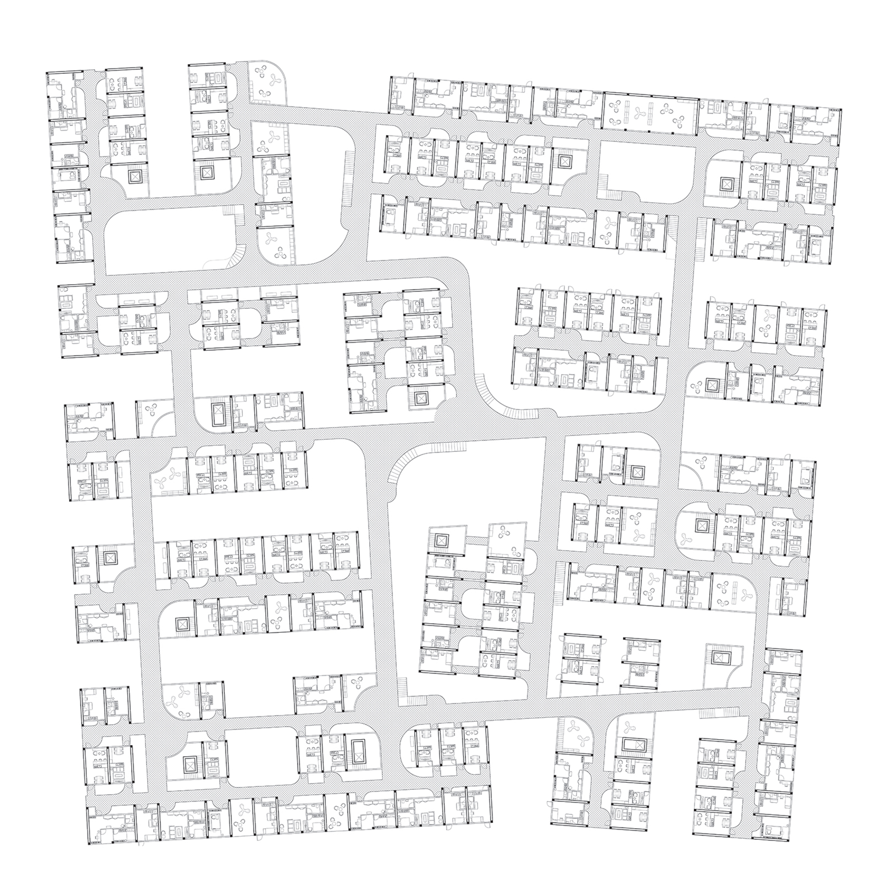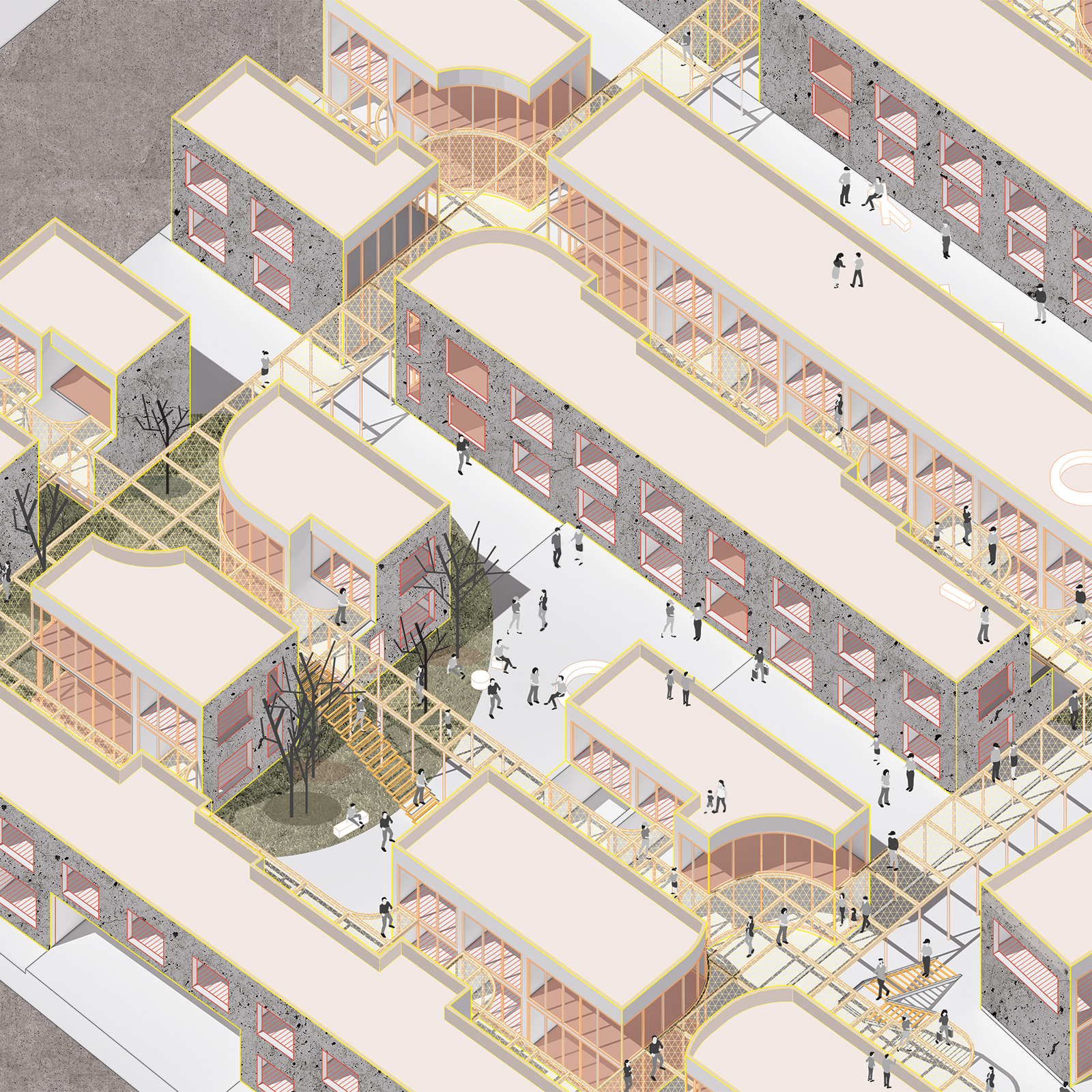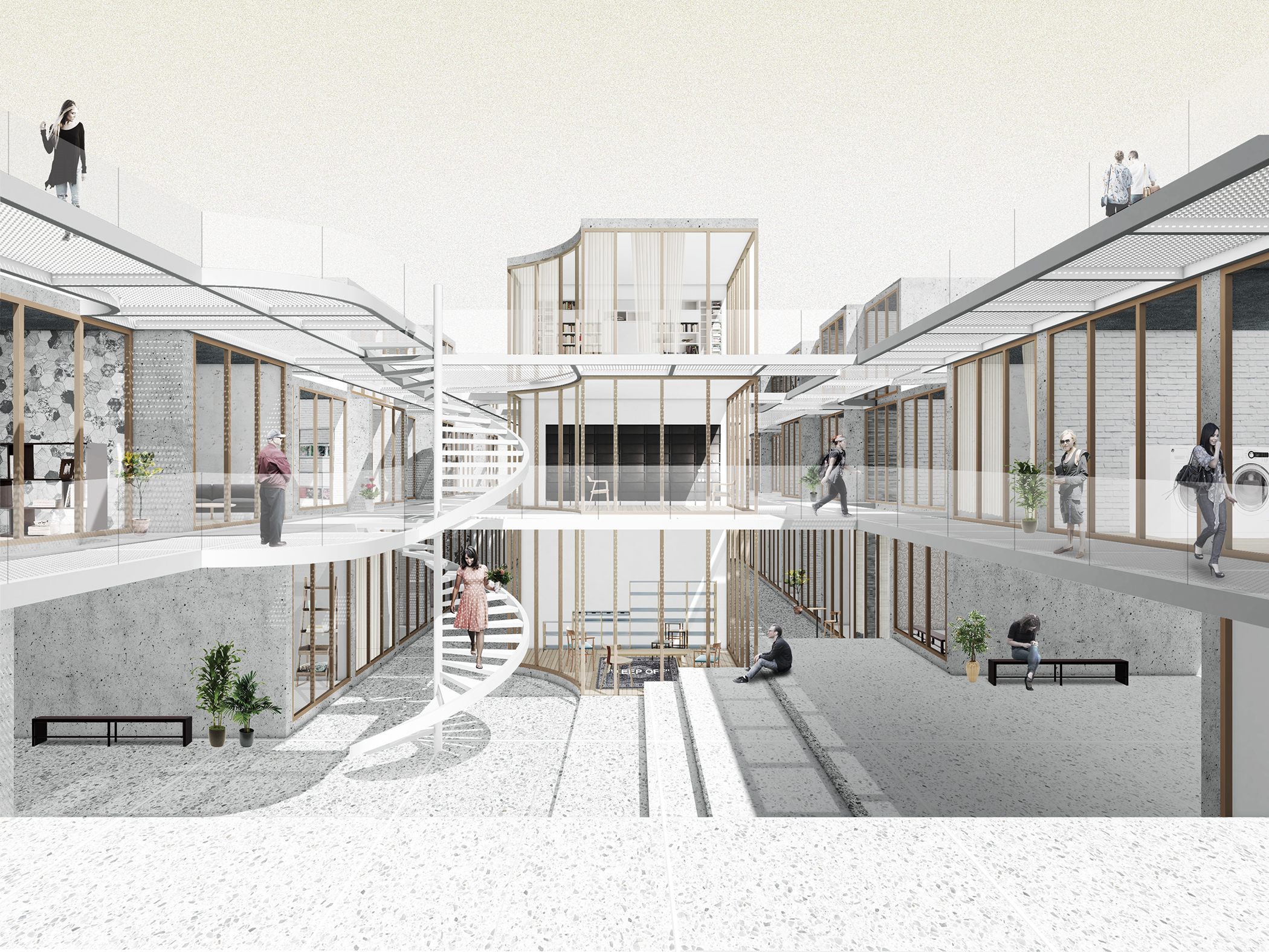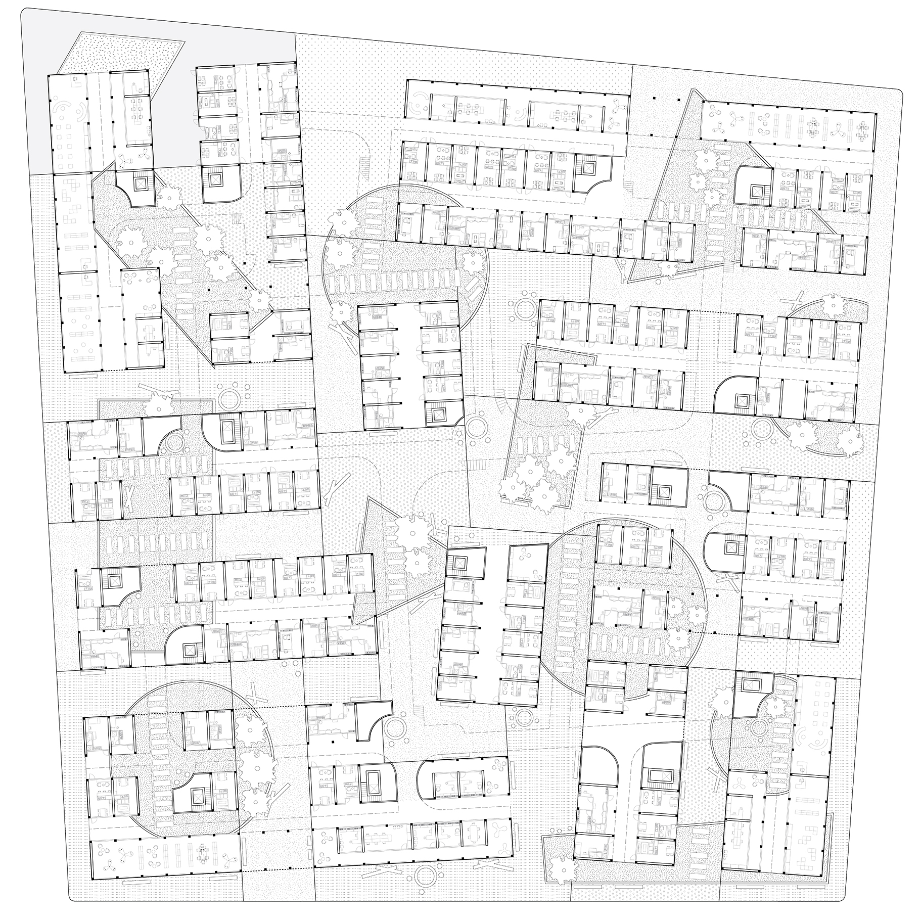 Housing complex project in Bronx, NY. The Project sought to demonstrate the needs for housing in the near future. Rather than fixed housing units by family type, housing units can proliferate by adding rooms depending upon the residents’ living conditions. The space in-between rooms, exterior corridors act as not only the pathways from rooms to rooms but also allow semi public spaces as small courtyards for users.