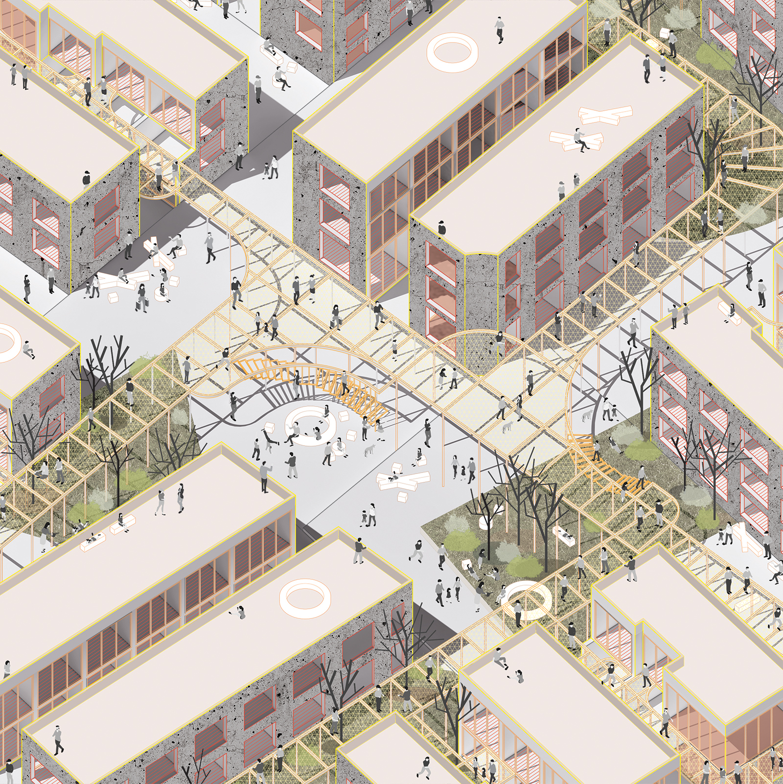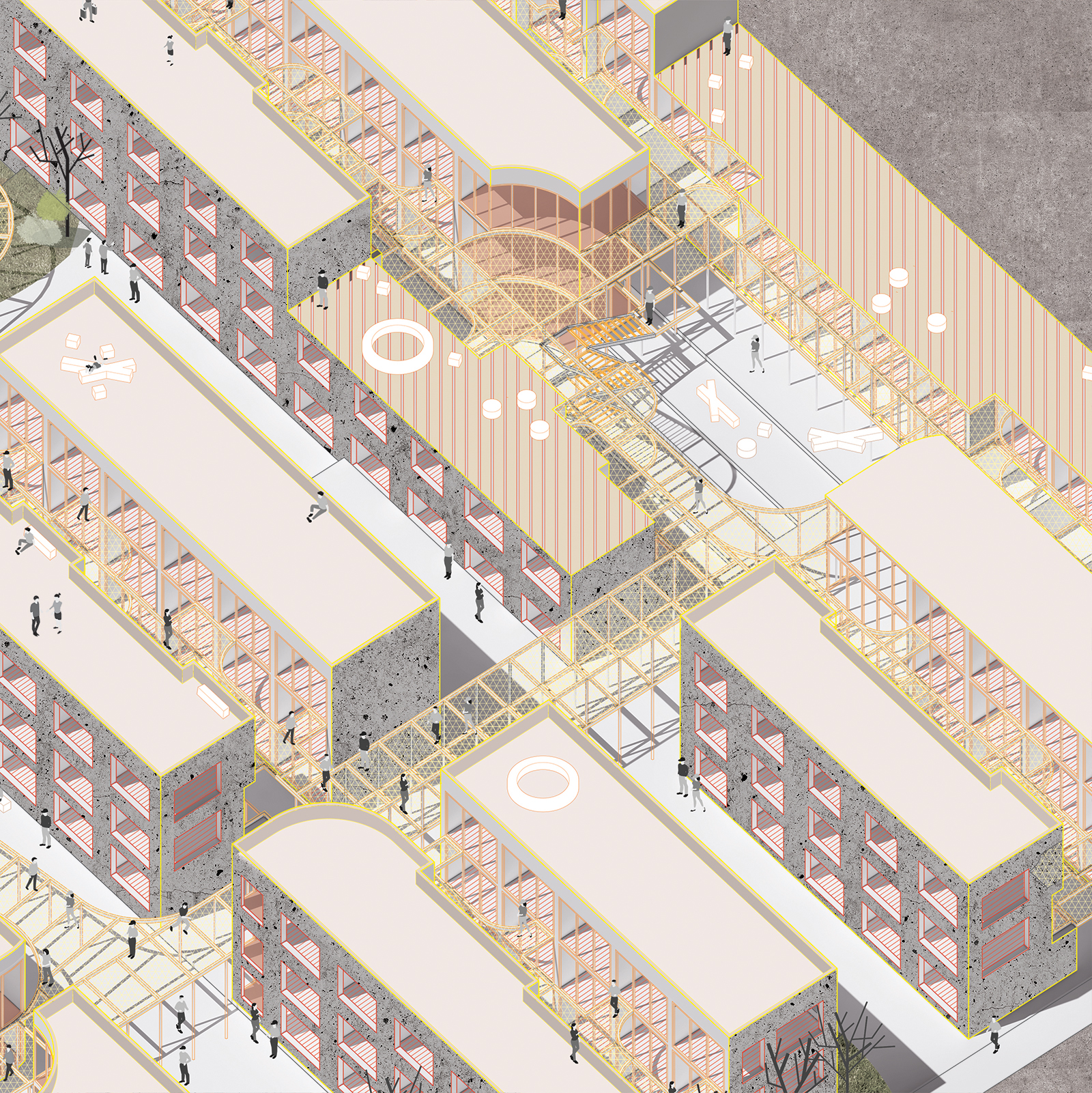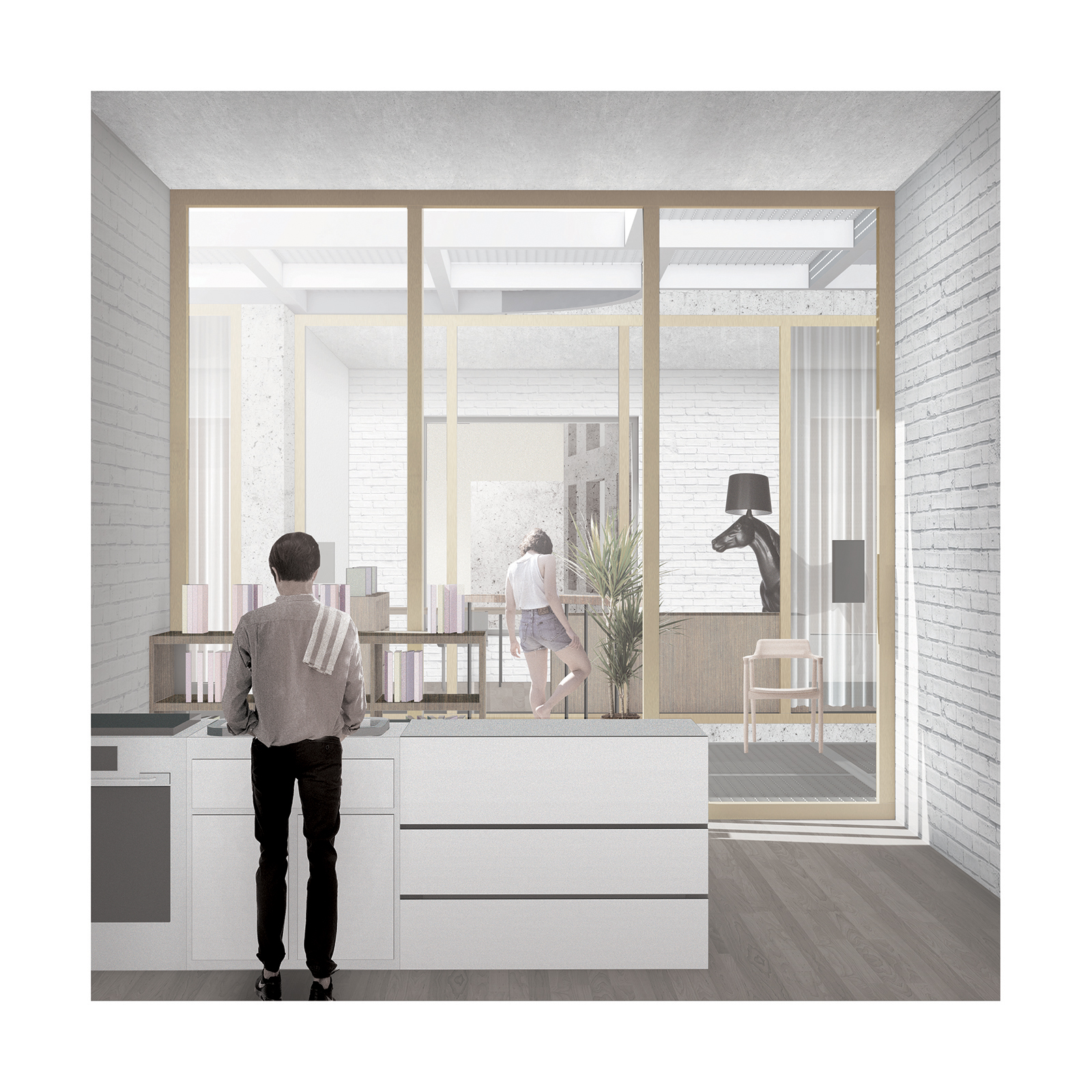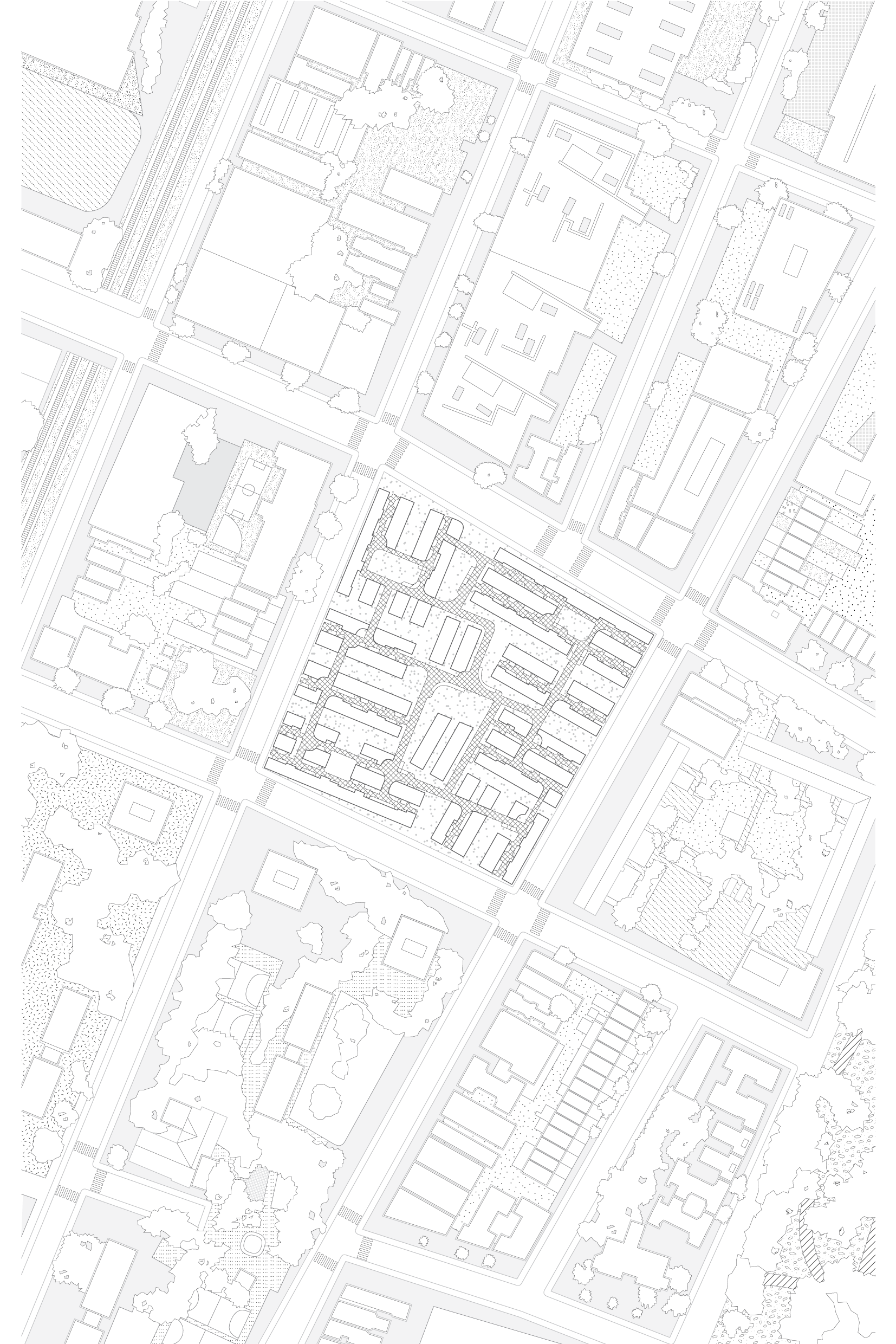 Housing complex project in Bronx, NY. The Project sought to demonstrate the needs for housing in the near future. Rather than fixed housing units by family type, housing units can proliferate by adding rooms depending upon the residents’ living conditions. The space in-between rooms, exterior corridors act as not only the pathways from rooms to rooms but also allow semi public spaces as small courtyards for users.